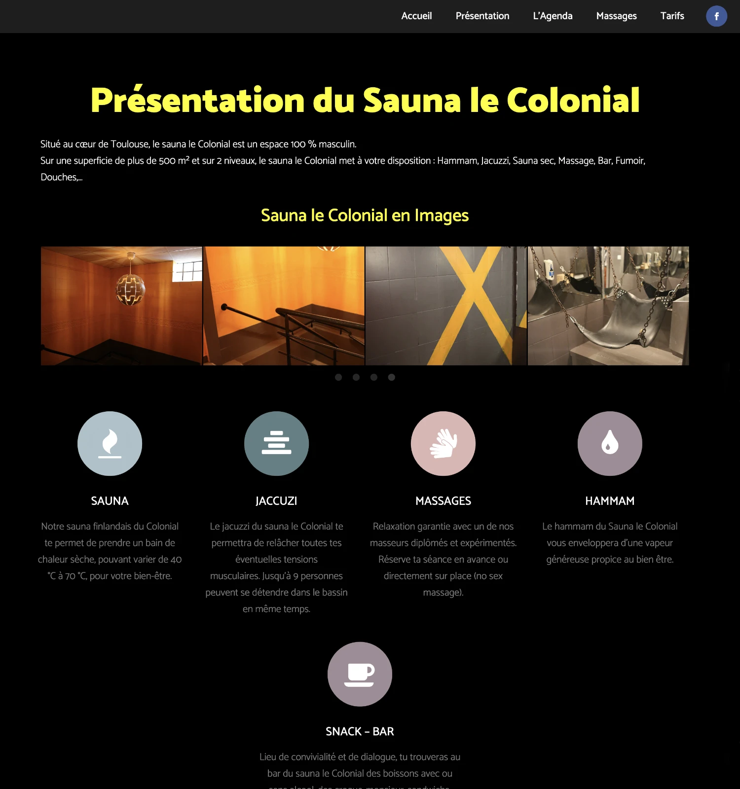 Créé en 2000 par l’agence Publi Media International, le site web du Sauna Le Colonial, un établissement emblématique de la scène gay de Toulouse, permet à l’internaute de trouver des informations détaillées sur les services disponibles au sein de l’établissement, tels que : hammam, jacuzzi, sauna sec, cabines privées, espace de détente, bar convivial,…